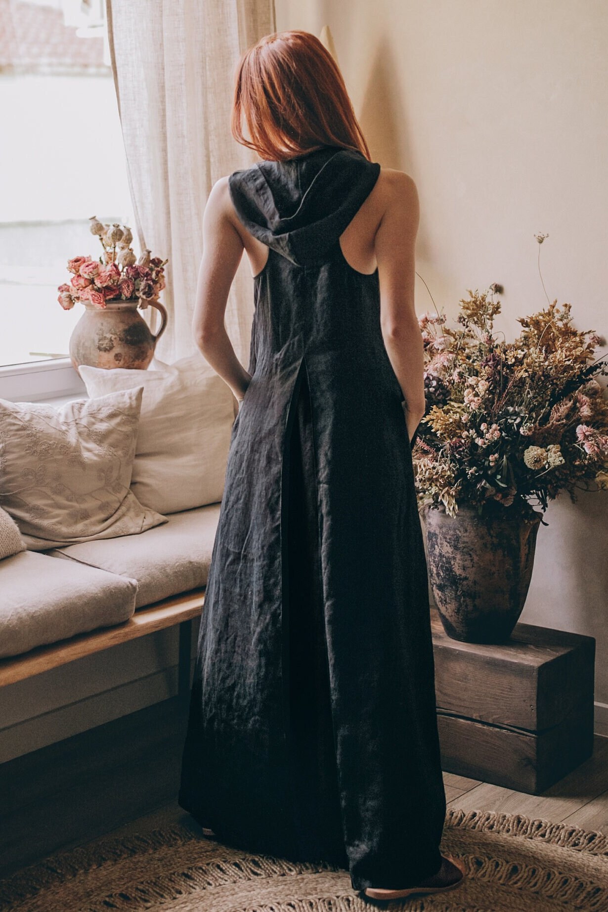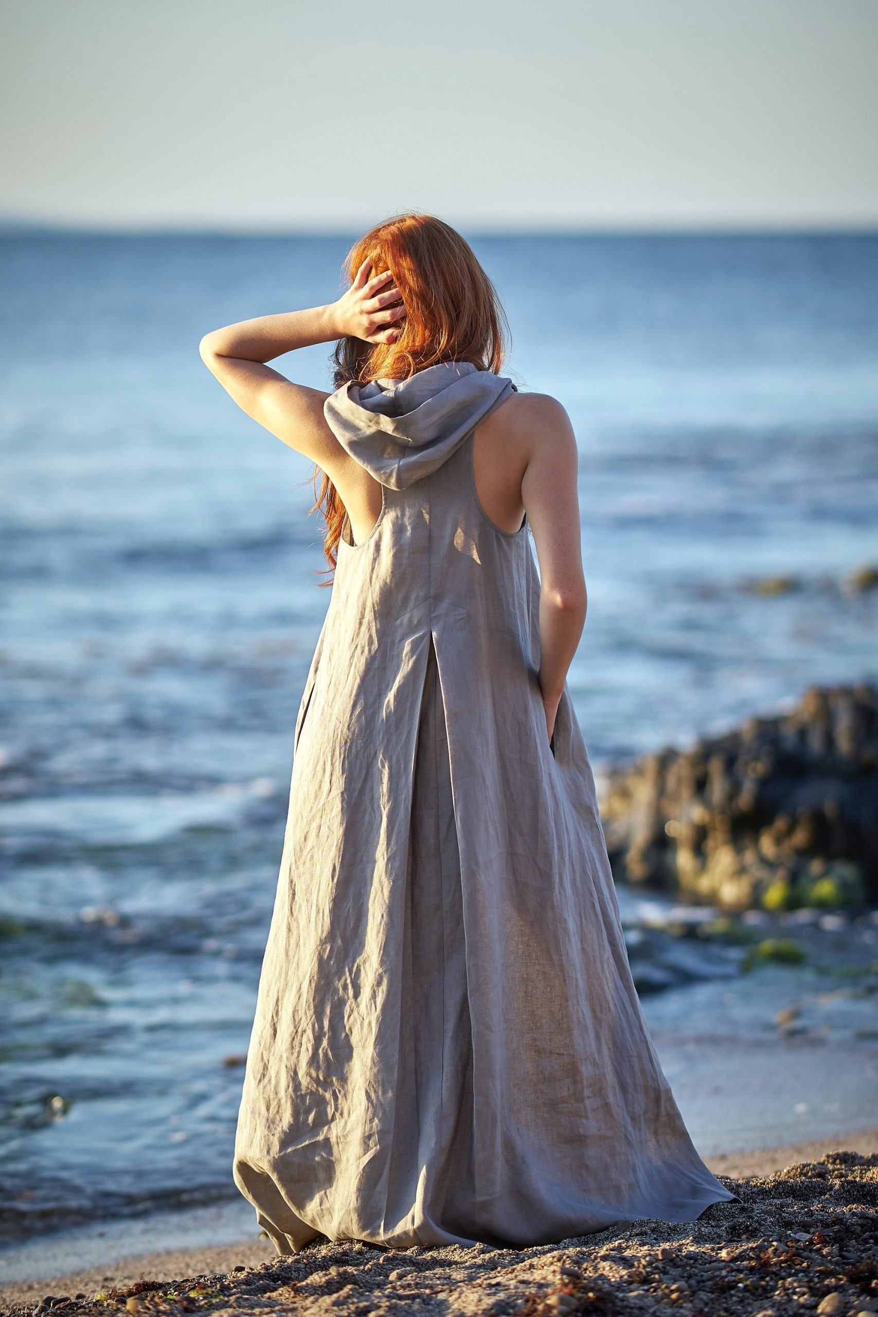 ♠ Relaxed summer dress made from high quality natural linen. An original design that features a loose hood and a racer back, split neckline, side pockets and a pleat detail at the back that creates a stunning silhouette. This maxi gown is made to be universally flattering for any size or shape and is one of our most loved pieces. Featured in a Dusty Turquoise color here, it could be created in a variety of colors.