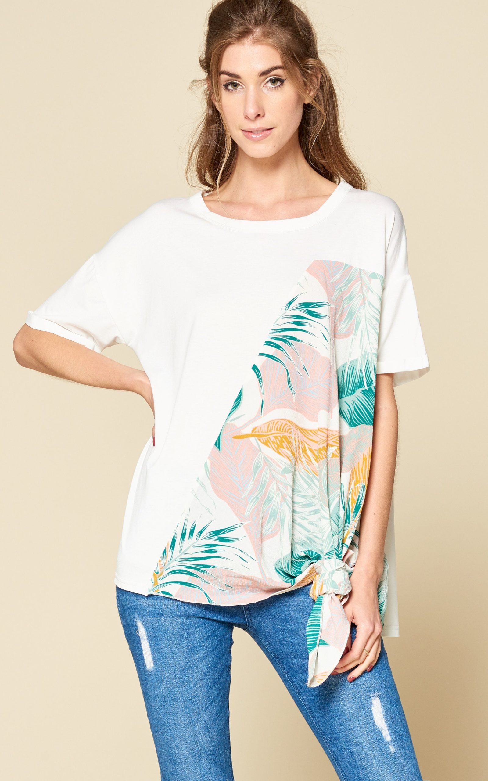 Comfy oversized short sleeved top featured with bubble fabric, tropical print, and side tie details.
