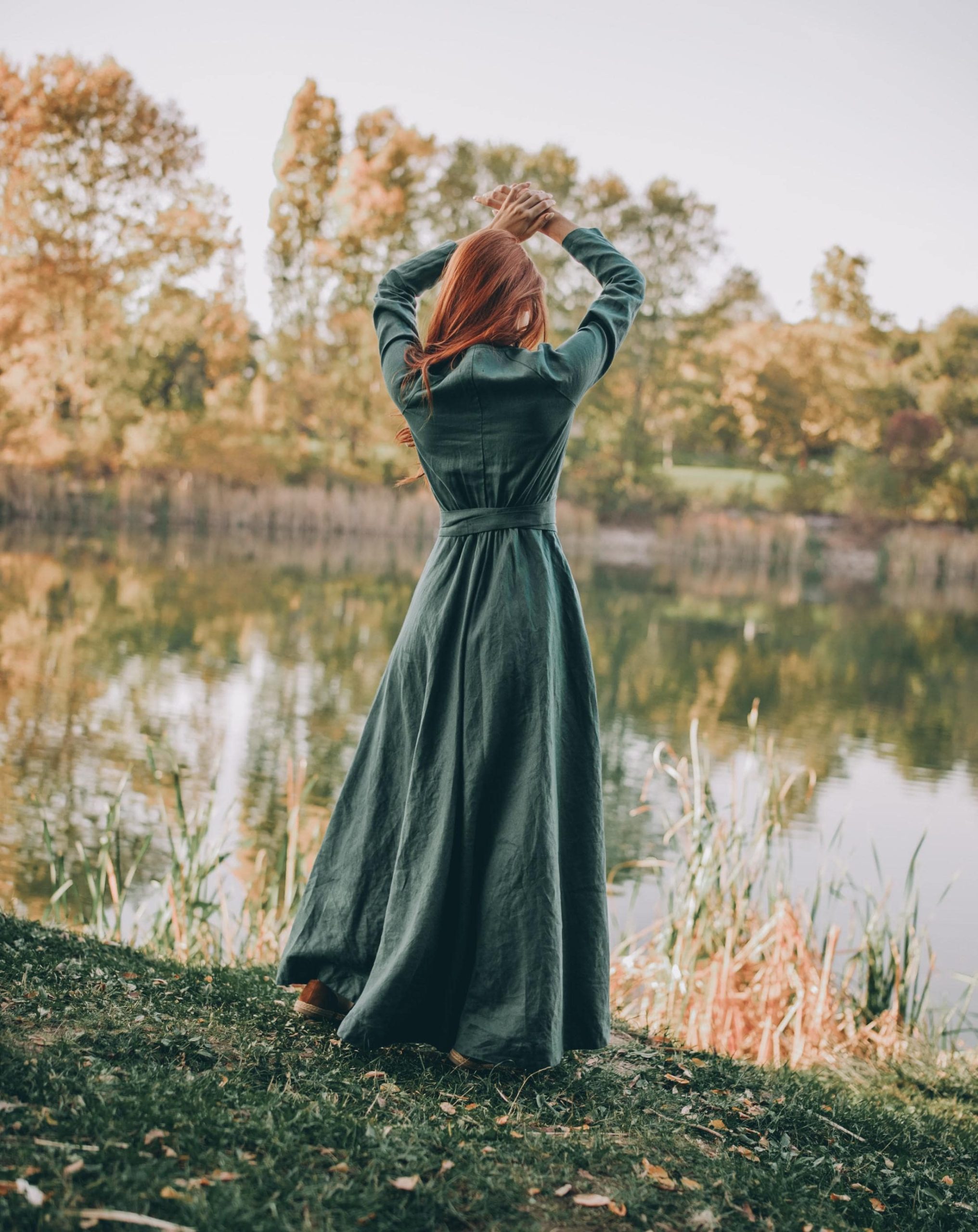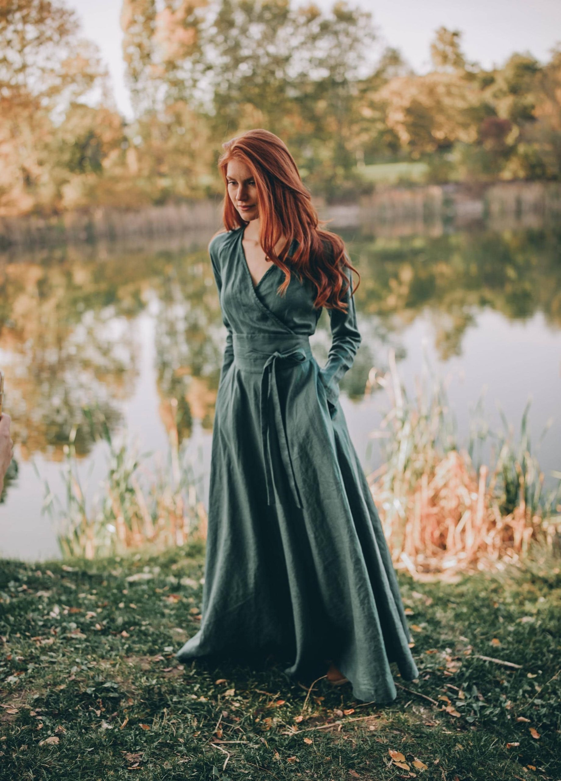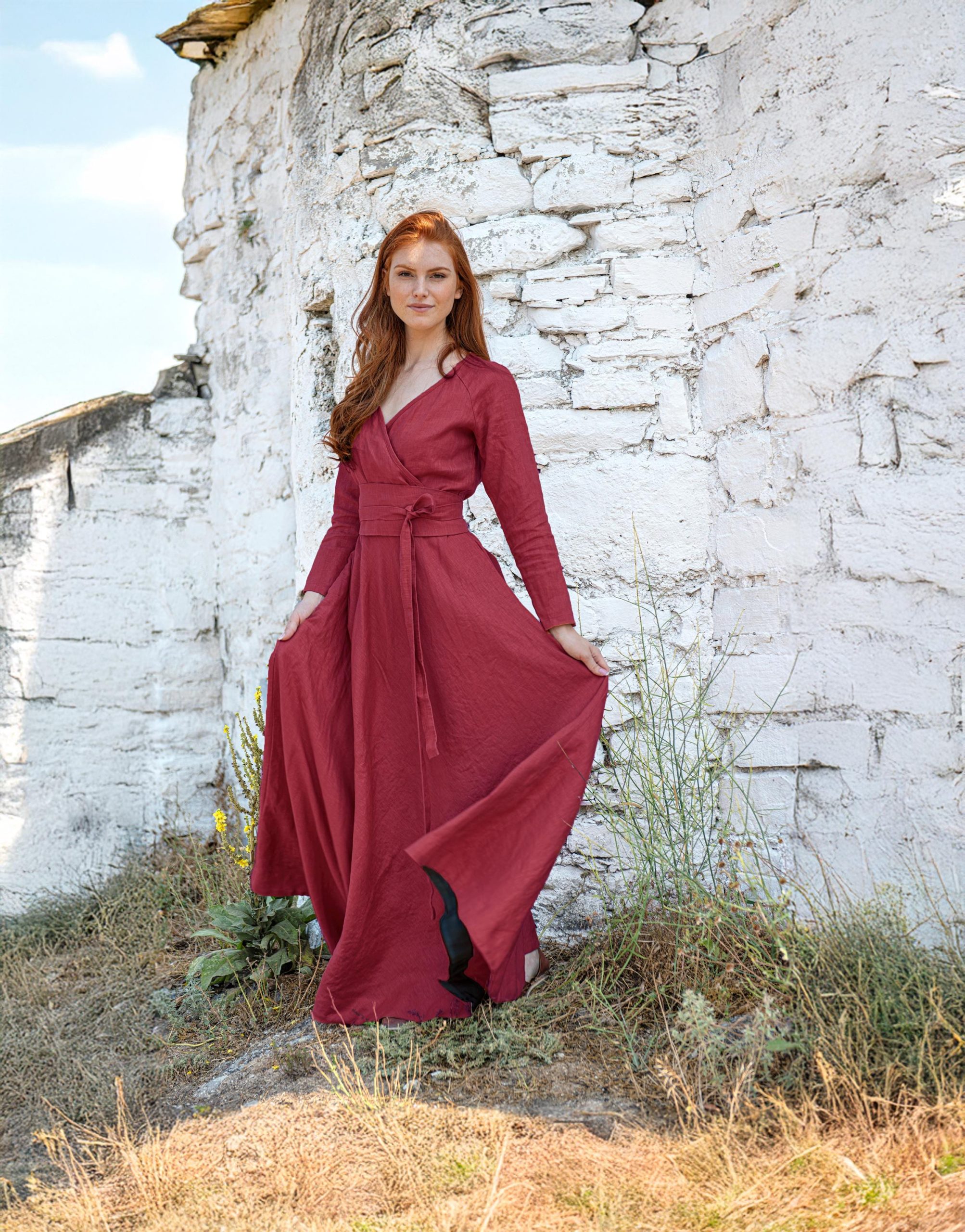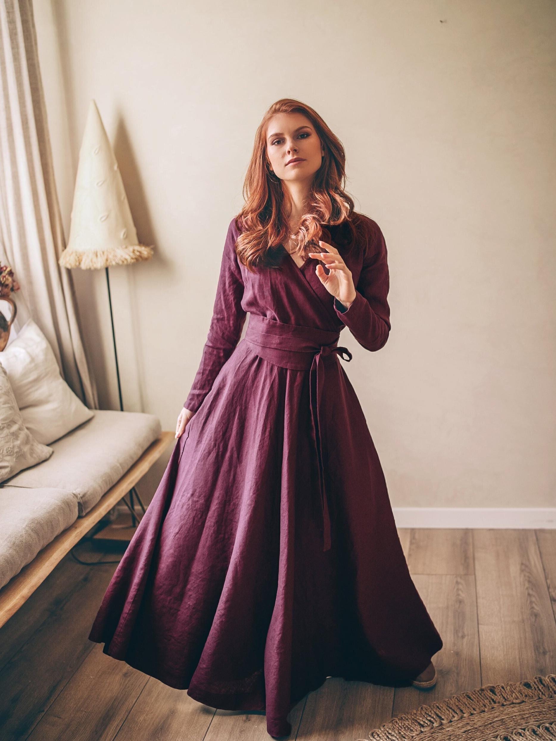 This universally flattering wrap top linen dress will be something you want to wear all the time. It is designed to fit all body shapes. You can wear it either as a loose or fitted dress, as the size can be adjusted. With its two side pockets and long sleeves, it assures irresistible comfort for daily wear. A beautiful alternative of our very much loved long sleeved wrap top dresses, this linen piece is available to order in all the different colors from our palette.